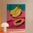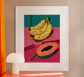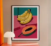 Un'illustrazione audace e ispirata alla pop art di banane e papaya su un piatto rosso brillante. I colori ad alto contrasto e lo stile grafico creano una dichiarazione vibrante e giocosa.