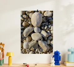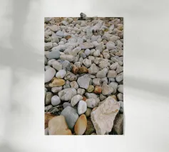 Rocce di varie forme e dimensioni sono adagiate su una spiaggia, con un'attenzione particolare a una pietra unica e strutturata. L'ambiente appare tranquillo, con la luce del crepuscolo che mette in risalto il paesaggio naturale.