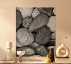Rocce di varie forme e dimensioni sono adagiate su una spiaggia, con un'attenzione particolare a una pietra unica e strutturata. L'ambiente appare tranquillo, con la luce del crepuscolo che mette in risalto il paesaggio naturale.