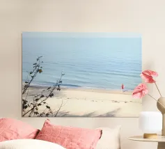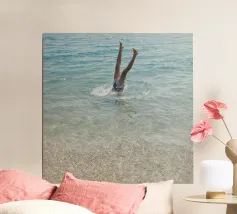 Portate un tocco di beatitudine estiva nel vostro spazio con questa deliziosa foto di una serena scena di spiaggia. Alcune persone si godono l'acqua e una galleggia su un fenicottero rosa gonfiabile vicino alla riva. Questa incantevole immagine è ideale per tutti coloro che desiderano catturare l'essenza di una tranquilla giornata in spiaggia e portare un senso di calma e gioia al proprio arredamento.