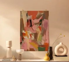 Forme energiche in rosa, corallo e caramello creano una composizione gioiosa ispirata al design boho retrò. Vibrante e piena di personalità.