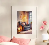 Poltrona accogliente Lampade e finestra in una stanza illuminata dal sole carta hahnemühle