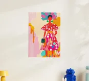 Una vibrante e festosa illustrazione di Pop Art massimalista dominata da una figura femminile stilizzata e sicura di sé. Il soggetto indossa un completo a due pezzi composto da un top rosso a pois e da una gonna intera astratta dipinta con pennellate caotiche ed energiche in rosa shocking, arancione, viola, giallo e verde, stratificate con pois bianchi oversize. Il suo look è altamente drammatico, coronato da un cappello a tesa larga impreziosito da pennellate luminose e piumate di colore verde acqua e rosa. Accessoriata con collane di perle stratificate, grandi orecchini verdi e verde acqua e una pochette blu scuro. L'intera composizione è ambientata a