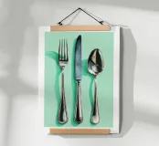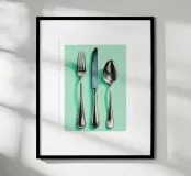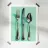 Elegante acquerello di forchetta coltello e cucchiaio con riflessi su sfondo verde menta. Arte da parete minimalista per la cucina, adatta a sale da pranzo, caffè e spazi culinari moderni.