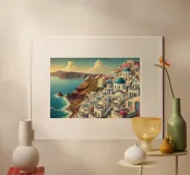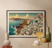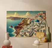 Poster di viaggio vintage di Santorini, Grecia, con case bianche sulla scogliera, cupole blu, strette scale e terrazze, una tranquilla baia dell'Egeo all'interno della caldera, piccole imbarcazioni sottostanti e una tenue foschia al tramonto. Le forme geometriche pulite, la sottile texture della carta e la tavolozza luminosa delle isole creano una stampa mediterranea senza tempo, ideale per soggiorni, camere da letto, arredamento costiero e spazi per le vacanze.