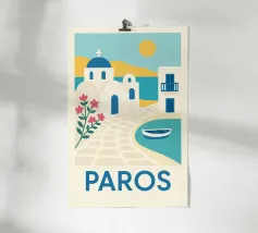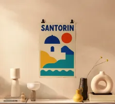 Questo poster vintage di Santorini illustra il fascino unico dell'isola greca con le sue case bianche, la cupola blu e le bouganville in fiore sul bordo del Mar Egeo. Un poster mediterraneo luminoso che invita al viaggio e al relax.