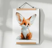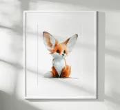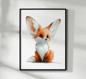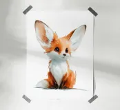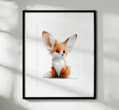 Adorabile illustrazione ad acquerello di un piccolo fennec con grandi orecchie e occhi accattivanti. Questo poster tenero e luminoso è perfetto per aggiungere morbidezza, fantasia e un tocco selvaggio alla decorazione murale della cameretta di un bambino o di una bambina.