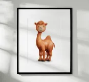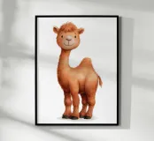 Affascinante illustrazione ad acquerello di un simpatico cammello, dai colori caldi e dall'espressione felice. Un disegno pieno di morbidezza e originalità, perfetto per aggiungere un tocco caldo ed esotico alla cameretta di un bambino o di una bambina.