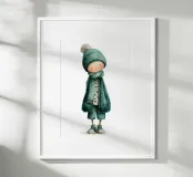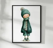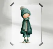Affascinante poster ad acquerello con un bambino con cappello verde e sciarpa abbinata, in uno stile tenero e poetico. Un'illustrazione piena di dolcezza e innocenza, ideale per dare calore e fantasia alla cameretta di un bambino.