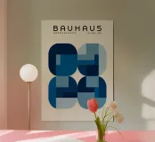 Questa splendida stampa d'arte digitale presenta un disegno geometrico composto da quattro quadrati interconnessi con angoli arrotondati, in una tavolozza di blu intensi e chiari. La composizione forma un motivo moderno e minimalista che cattura l'essenza del movimento Bauhaus e dell'arte di metà secolo. I testi "BAUHAUS AUSSTELLUNG" e "JULI-SEPT 1923" ancorano il disegno al suo contesto storico. Questo file ad alta risoluzione (7000x5000 pixel, 300 dpi) garantisce una qualità di stampa eccezionale per una varietà di prodotti.