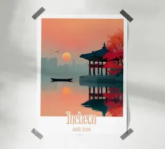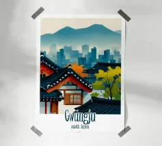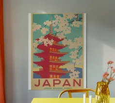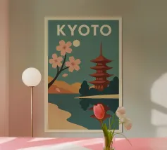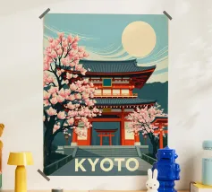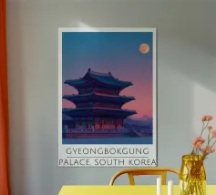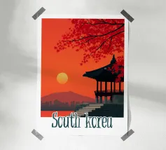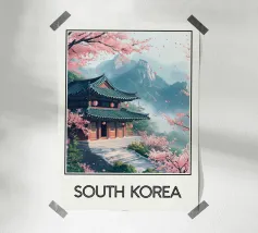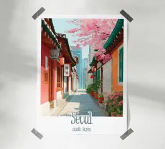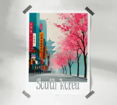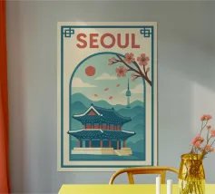 Ammirate un palazzo tradizionale di Seoul sotto gli alberi di ciliegio in fiore in questa illustrazione delicata e raffinata. Una scena intrisa di poesia coreana per valorizzare le vostre pareti.