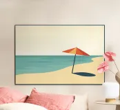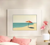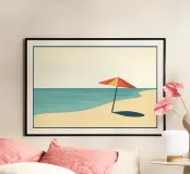 Celebrate il calore dell'estate con questo poster Vintage Beach. Il suo stile elegante e retrò è caratterizzato da un ombrellone, sabbia dorata e mare turchese. Una decorazione estiva elegante e minimalista, ideale per gli amanti del mare.