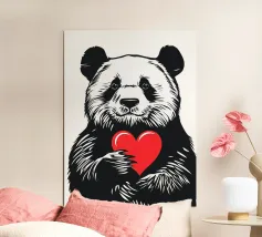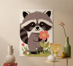 Un affascinante procione tiene in mano un vivace palloncino a forma di cuore, che emana uno spirito giocoso in un design minimalista. Lo sfondo caldo esalta l'atmosfera stravagante della scena.