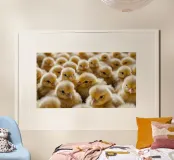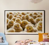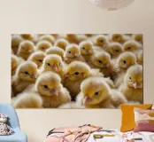 Un vivace gruppo di pulcini gialli riempie lo spazio, mettendo in mostra le loro morbide piume e le loro espressioni curiose. La luce calda esalta l'atmosfera accogliente della fattoria.
