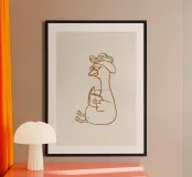 Un disegno al tratto davvero affascinante e stravagante di un'oca o un'anatra seduta che si gode un libro. Questo uccello intellettuale è vestito con occhiali rotondi e un giocoso cappello da cowboy con motivi floreali. L'illustrazione utilizza linee calde color terracotta/marrone su uno sfondo beige morbido e neutro, creando immediatamente un'atmosfera accogliente e contemporanea. La combinazione di linee semplici e di un soggetto unico rende questo pezzo umoristico ed estremamente estetico. Questo poster digitale di qualità superiore (7000x5000 pixel, 300 dpi) assicura che le linee giocose e le tonalità calde siano catturate con una nitidezza da rasoio, offrendo un'opera d'arte eccellente.