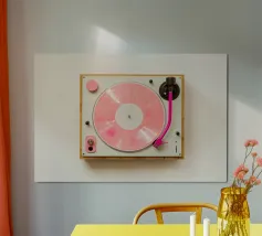 Questa immagine mostra un giradischi in stile vintage dal design chiaro e minimalista. Il giradischi è prevalentemente color pesca con una finitura opaca e un disco verde chiaro sul piatto. Il braccio, che si trova sul lato destro, è anch'esso color pesca con accenti beige e un cavo nero che lo affianca. Lo sfondo è di un colore neutro bianco sporco che si integra con i toni pastello del giradischi. L'estetica complessiva è moderna, con un tocco retrò.