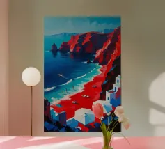 Quest'opera d'arte offre un'energica rappresentazione della Spiaggia Rossa di Santorini, con le sue imponenti scogliere rosse e il mare blu intenso. Le barche scivolano sulle acque calme, mentre i frequentatori della spiaggia si godono le coste assolate. Lo stile audace ed espressionista enfatizza il contrasto tra le rocce rosso fuoco e i toni sereni e freddi dell'acqua. Catturando sia la vivacità che la serenità di questa famosa destinazione, il dipinto dà vita all'essenza di una perfetta fuga nel Mediterraneo.