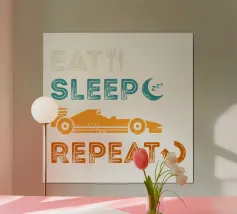 Un'ambientazione accogliente è caratterizzata da un cuscino, una lampada e due tazze, che evocano un senso di relax. La frase "Riposare, ricaricare, ripetere" rafforza il tema della calma e del ringiovanimento.