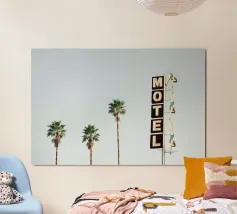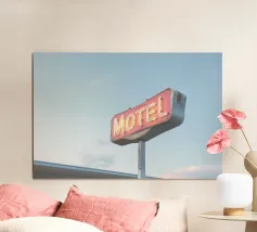 Una classica insegna retrò "MOTEL" risplende contro un cielo serale blu intenso, affiancata da palme in primo piano. L'immagine cattura un'atmosfera nostalgica e cinematografica che ricorda un classico viaggio americano in macchina.