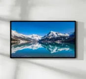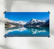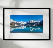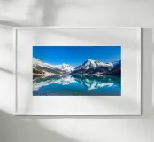 Un cielo azzurro e limpido si riflette perfettamente in un lago sereno circondato da maestose montagne innevate. Questa splendida scena cattura l'essenza della bellezza e della tranquillità della natura.