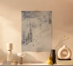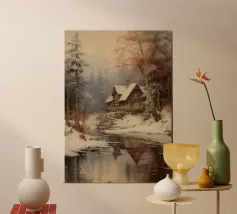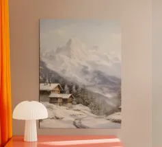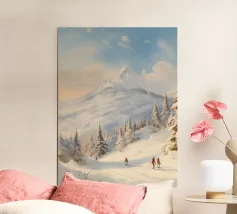 Questa suggestiva immagine invernale mostra una baita innevata circondata da maestosi abeti e cime impervie. Davanti alla baita, sciatori e bambini scivolano felici sulla neve, conferendo alla scena un'atmosfera vivace ma tranquilla. I colori tenui del cielo in contrasto con il bianco del paesaggio creano un motivo invernale armonioso e romantico, ideale per chi ama la magia della montagna. Perfetto per murales, poster, tazze, cover per cellulari, cuscini, tende da doccia e T-shirt.