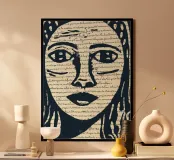Ritratto femminile tra linee calligrafiche, la particolarità di questa linoleografia è che è stampata sulla pagina di un libro del 1850 che ho trovato in un mercatino delle pulci (che evoca varie calligrafie antiche). Mi ha subito ispirato e l'ho conservato per diversi anni come un tesoro, volendo condividerlo con gli amanti delle opere antiche e contemporanee.