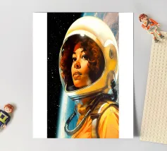 Portrait of a Space Dreamer cattura lo spirito di esplorazione e la forza della curiosità umana. Questa splendida opera d'arte raffigura un'astronauta donna sicura ed equilibrata, con un'espressione che brilla di determinazione e meraviglia. Incorniciato dalla curva della Terra e da uno sfondo di stelle scintillanti, questo ritratto unisce l'estetica retrofuturistica all'ispirazione moderna.
