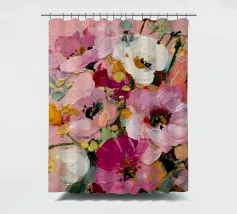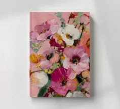 Un dipinto floreale astratto che fonde rosa tenue, oro e avorio con strati espressivi e strutturati. La tavolozza sognante e la pennellata tattile le conferiscono una qualità artigianale: elegante, senza tempo e piena di vita.