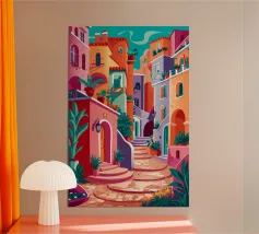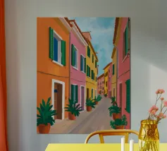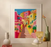 Una ripida scalinata colorata funge da strada in una città mediterranea, fiancheggiata da edifici di colore giallo, arancione e rosa, ornati da piante verdi in vaso.