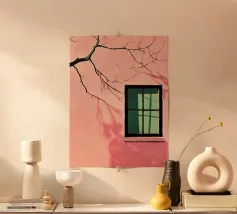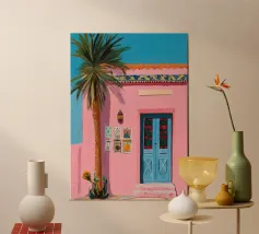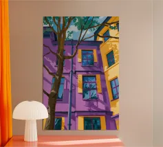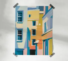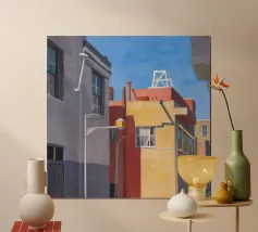 Una complessa scena urbana è resa con un'attenzione particolare alle forme geometriche e a un'audace tavolozza di colori rosa, verde acqua e rosso. Una scala esterna fornisce un forte elemento compositivo, guidando l'occhio attraverso le forme architettoniche astratte.