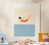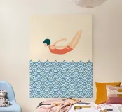 Questa immagine artistica mostra una donna stilizzata in costume da bagno rosso che si tuffa elegantemente in mare: un simbolo di libertà, leggerezza e sensazione estiva. Le forme chiare, le onde blu e i tenui colori pastello conferiscono al motivo un fascino moderno e retrò in stile metà secolo. Perfetto per gli amanti dell'arte minimalista, dell'estetica vintage e dei momenti estivi mediterranei. Ideale come decorazione murale per il soggiorno, il bagno, la camera da letto o la casa delle vacanze, o come oggetto decorativo, porta immediatamente un'atmosfera vacanziera e un'energia positiva in ogni stanza. Poster estivo, illustrazione di figura balneare