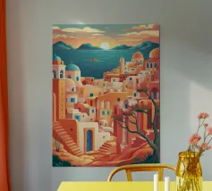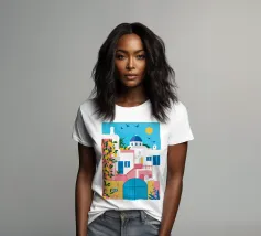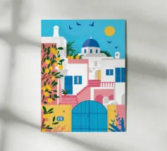 Una scena pittoresca di Santorini è caratterizzata da iconici edifici bianchi con cupole blu e una porta blu vibrante, che si affaccia sul mare scintillante sotto un cielo limpido con uccelli, incarnando il fascino idilliaco dell'isola greca.