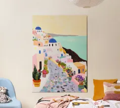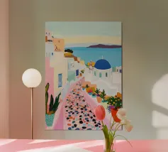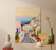 L'immagine mostra un idilliaco paesaggio costiero con case imbiancate a calce, porte e finestre blu e tetti color arancio, che si adagiano come terrazze su una scogliera rocciosa. Sullo sfondo svetta un mulino a vento, mentre il mare blu intenso luccica sotto un cielo limpido. Una vegetazione rigogliosa e fiori colorati costeggiano i sentieri. Lo stile è pittoresco e romantico, ispirato all'architettura mediterranea - in particolare all'isola greca di Santorini - e trasmette tranquillità, calore e bellezza senza tempo.