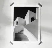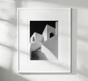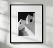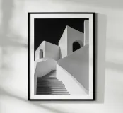 Poster in bianco e nero dell'architettura mediterranea: una scala monumentale che si snoda tra pareti immacolate e archi luminosi, sotto un cielo scuro che accentua il contrasto. Linee sinuose, dolci ringhiere e ombre grafiche creano una prospettiva zen e contemporanea verso l'alto. Un elegante poster da parete per il soggiorno, il corridoio o la camera da letto, che amplia visivamente lo spazio e si abbina a decori scandinavi, giapponesi, wabi-sabi o minimalisti.