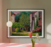 Una bella scalinata in pietra, fiancheggiata da un fogliame verde e da vivaci fiori rosa, conduce a una villa serena, creando una scena di giardino invitante e tranquilla, piena di vita e di colori.