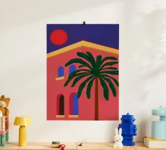 Scale rosse e vivaci conducono verso l'alto passando davanti a una finestra che rivela un cielo soleggiato, una palma e un sole splendente, a simboleggiare un viaggio verso una destinazione gioiosa.