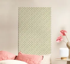 Un motivo ripetuto presenta forme geometriche nere su uno sfondo grigio chiaro, creando un design ritmico e visivamente accattivante. Le forme sono uniformemente distanziate e contribuiscono a creare un senso di ordine ed equilibrio.