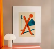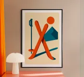 Due sci incrociati, una silhouette geometrica, un sole senza peso. L'inverno diventa pop, elegante e raffinato. Un poster che reinventa lo sci in uno stile di design moderno.
