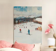 Allegri sciatori sfrecciano su una pista innevata, passando accanto ad accoglienti rifugi di montagna circondati da abeti innevati e montagne imponenti. L'immagine cattura l'idillio invernale, la magia delle montagne e la gioia degli sport invernali. Una scena suggestiva che riflette il fascino di una vacanza sulle Alpi e il calore di una comunità invernale.
