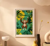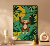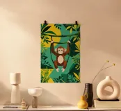 Scimmia felice appesa a una vite con fogliame carta hahnemühle