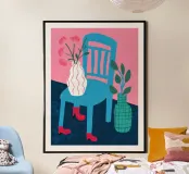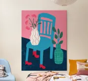 Un'affascinante ed eccentrica natura morta con una pianta in vaso appoggiata su una sedia blu brillante. La composizione è semplice ma piena di carattere, con colori vivaci e uno stile giocoso.