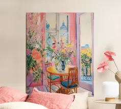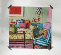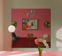 Una scena d'interni con una poltrona vuota rivestita con un motivo chintz floreale, riflessa in un grande specchio. La stanza è dipinta nei toni del rosa e del rosso, creando un'atmosfera calda, accogliente e leggermente nostalgica.