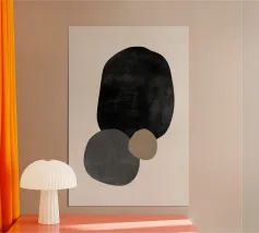 Una grande forma nera irregolare è posizionata al centro su uno sfondo più chiaro a contrasto, dall'aspetto ruvido e strappato. Il design è minimalista, con un'atmosfera astratta e una tavolozza di colori semplice.