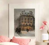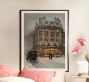 Un romantico paesaggio urbano dal sapore invernale: una carrozza nera trainata da cavalli si ferma nella neve fresca davanti a un magnifico edificio antico con finestre illuminate in modo caldo. Due persone elegantemente vestite sono impegnate in una conversazione, mentre i lampioni gettano una luce dorata sulla strada innevata. La scena racconta di un'epoca passata, dell'eleganza e della tranquilla bellezza di una serata innevata in città.