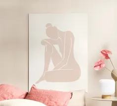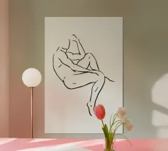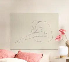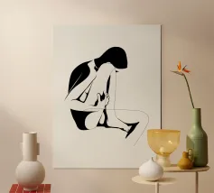 Un semplice disegno al tratto raffigura una persona seduta con i capelli ricci, le braccia avvolte intorno alle ginocchia. Lo stile minimalista utilizza linee morbide e fluide per trasmettere un senso di calma e introspezione.