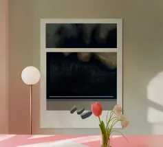 Il blu acceso su uno sfondo minimalista di beige crea un contrasto sorprendente. L'inserimento di accenti arancioni a contrasto aggiunge profondità e calore alla composizione. L'inclusione di piccole forme geometriche in toni neutri nell'angolo in alto a destra della composizione offre una texture visiva sottile ma accattivante, migliorando l'estetica complessiva.
