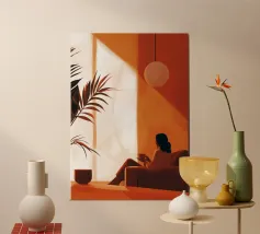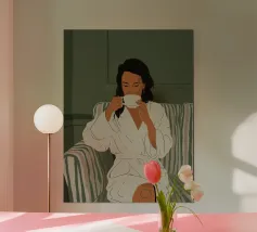 Mescolando toni di metà secolo e grazia moderna, questo pezzo esplora l'intersezione tra forma e solitudine. La palette di colori tenui e la geometria audace riecheggiano la presenza tranquilla della donna, creando una composizione che sembra un jazz visivo, sofisticato e senza sforzo.
