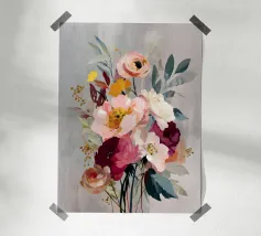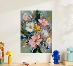 Delicati fiori rosa e foglie verde acqua si fondono in una composizione calma ed equilibrata. Questa stampa irradia grazia femminile e aggiunge un tocco di serenità a qualsiasi spazio abitativo.