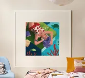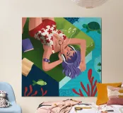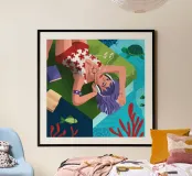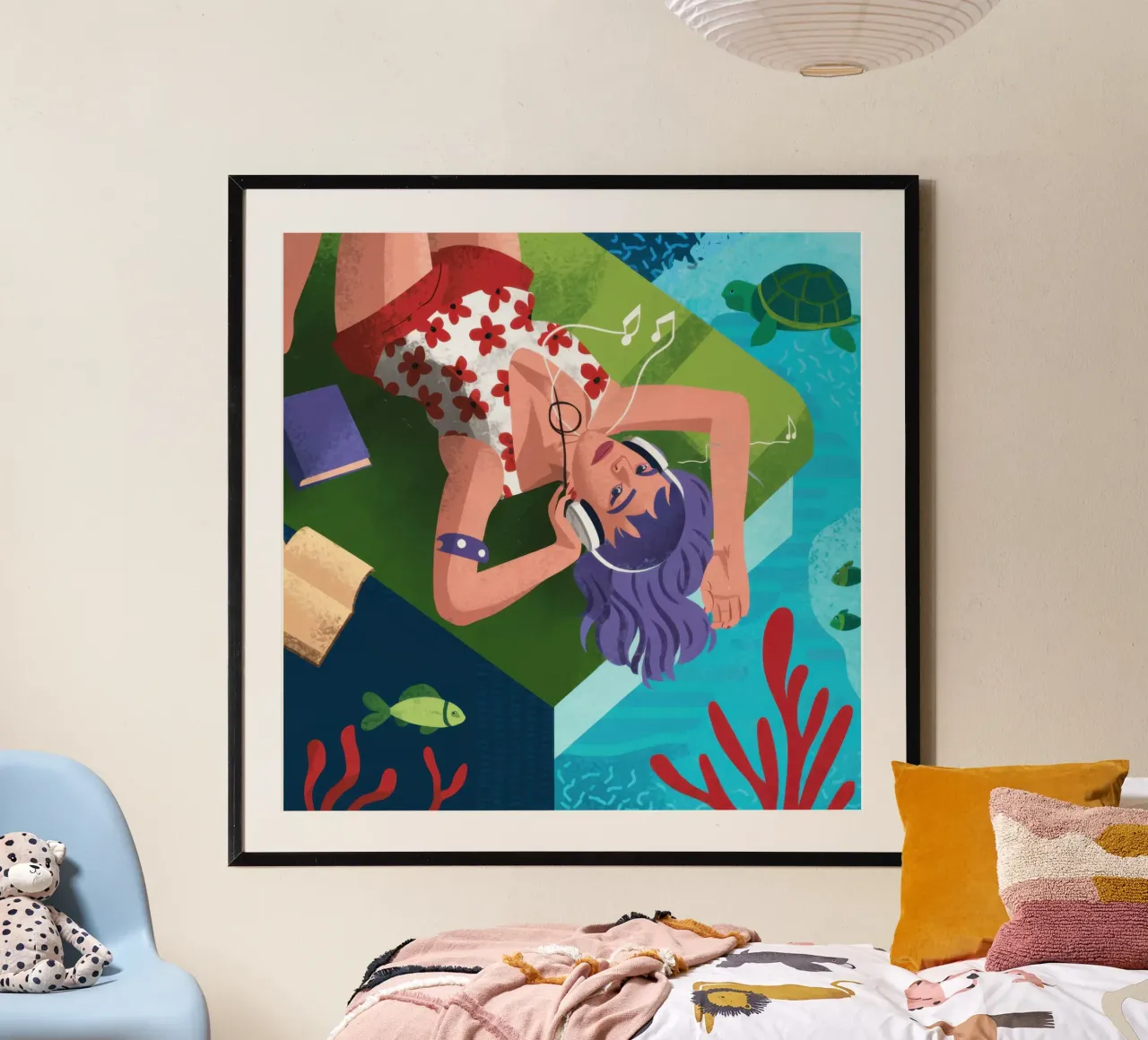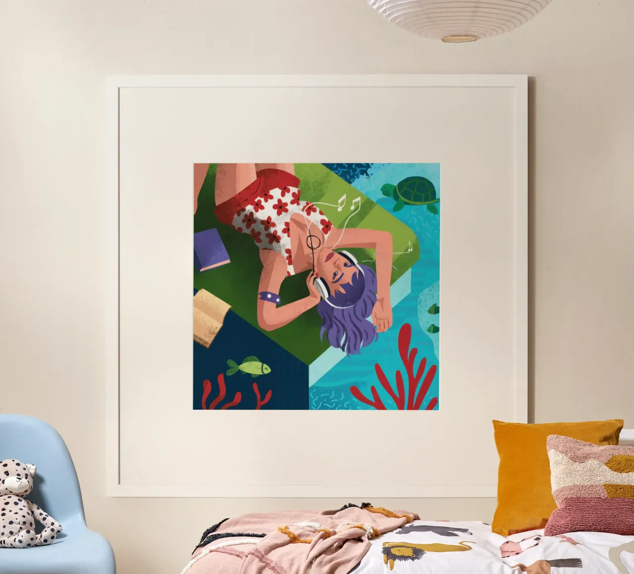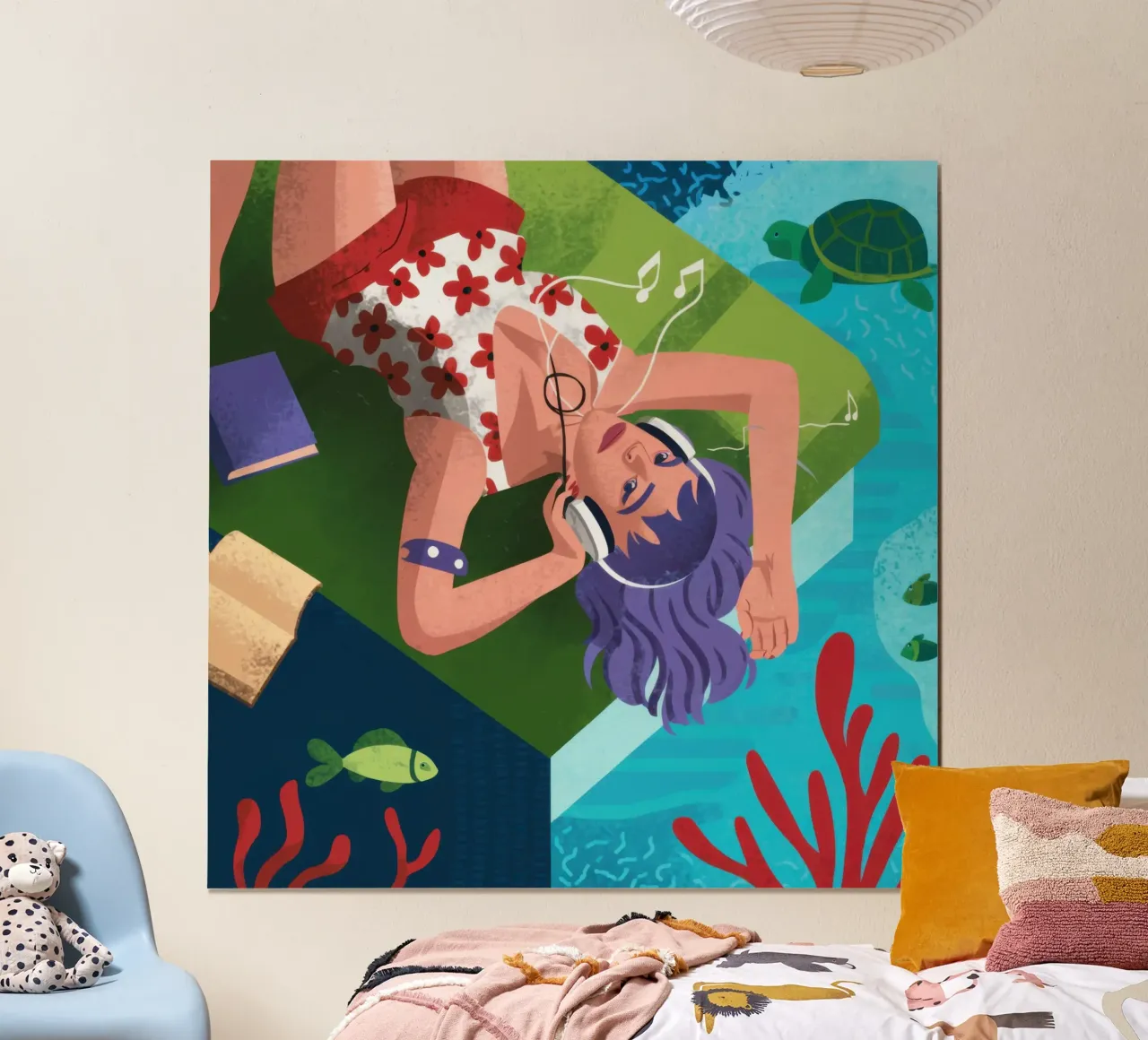 Una persona con cuffia e occhialini retrò galleggia tranquillamente nell'acqua turchese, circondata da pesci colorati e piante acquatiche, creando una scena subacquea serena e onirica.