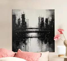 Una composizione surreale in bianco e nero con un'imponente struttura architettonica di ispirazione gotica circondata da acque ferme sotto una forte pioggia. L'illuminazione drammatica e il design intricato evocano un'atmosfera di struggente bellezza.